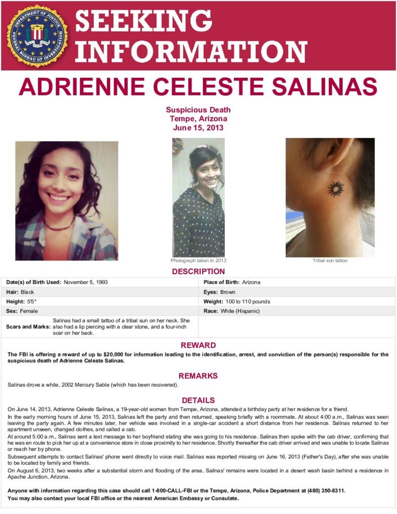 Federal Bureau of Investigation. (n.d.). Seeking information: Adrienne Celeste Salinas — Suspicious death, Tempe, Arizona, June 15, 2013. U.S. Department of Justice. ADRIENNE CELESTE SALINAS — FBI